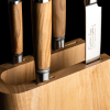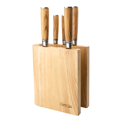 The Katana Saya Olivewood 6 Pce Knife Block Set comes with all your kitchen essentials. The knife block includes a 20cm Chef's Knife, 20cm Carving Knife, 20cm Bread Knife, 12cm Utility Knife and a 9cm Paring Knife. The knife set comes with a luxury solid wooden knife block in dark brown. The blades feature VG-10 Damascus steel which replicate the ancient techniques of sword making for the Japanese Samurai warriors. VG-10 stainless steel is hard and unbreakable, reaching a Rockwell hardness rating of up to 63HRC. It also delivers one of the best edge retentions in the market.